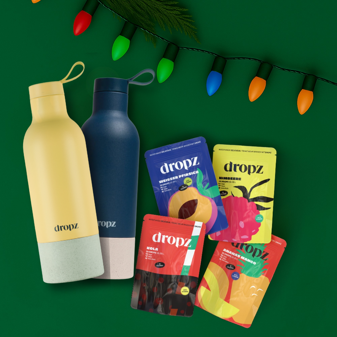 Das perfekte Geschenk für alle, die stylische Hydration lieben – unser exklusives Christmas Set kombiniert unsere 4 beliebtesten Geschmacksrichtungen (Kola, Pfirsich, Ananas-Mango, Himbeere) mit 2 Dropz Bottles (0,5 L) in Gelb und Blau.