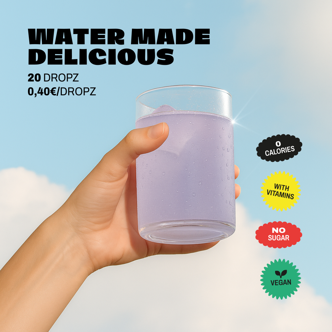 Ein Dropz reicht für 250–500 ml Wasser — je nachdem, wie intensiv du den Geschmack haben möchtest.