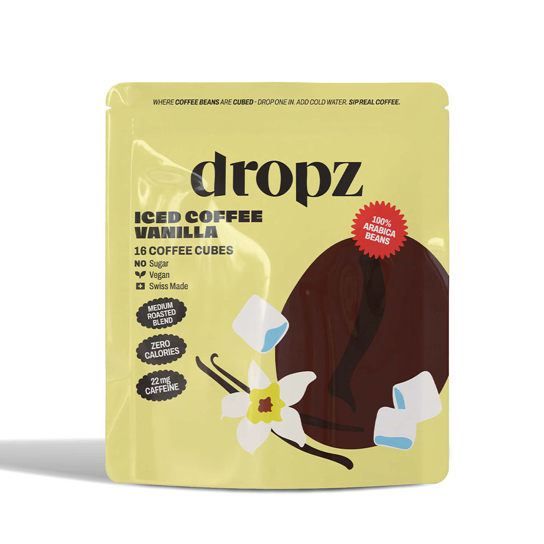 Iced Coffee Cubes sind Würfel aus echtem gebrühten Kaffee, Schock gefroren, um Aroma und Koffein zu bewahren. Einen dropz Cube ins Glas geben, kaltes Wasser darauf giessen, trinken, geniessen. Wie du es magst: pur, mit Hafermilch oder auf Eis.