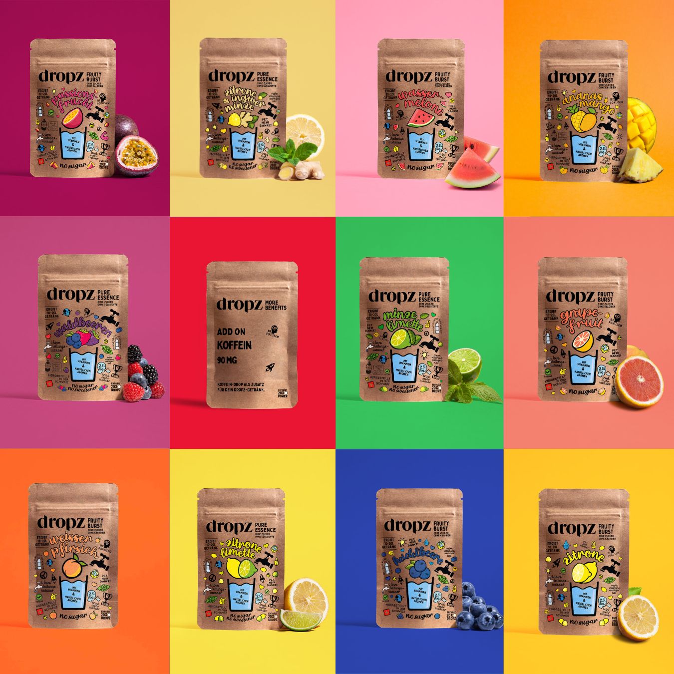 Fruchtig intensiv und mit wertvollen Vitaminen! Die dropz Fruity Burst Linie bietet dir eine fruchtig intensive, gesunde und nachhaltige Alternative zu bestehenden Süssgetränken. Ganz ohne Zucker und ohne Kalorien.