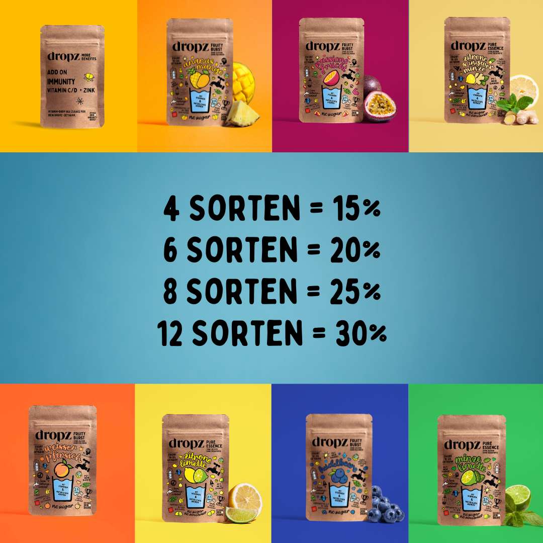 Ein Dropz reicht für 250–500 ml Wasser — je nachdem, wie intensiv du den Geschmack haben möchtest.